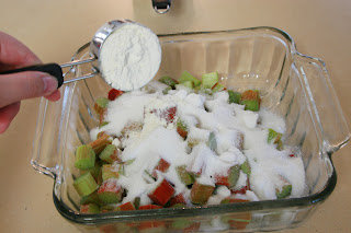 Combine rhubarb, sugar, 1/4 cup of the flour, and cinnamon. Put in greased 9x9" baking dish. (I used an 8x8 dish).